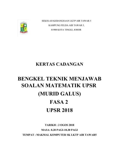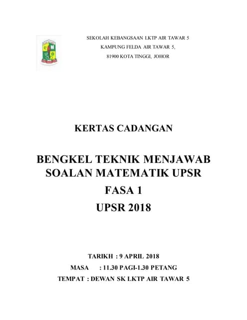 Tema pertandingan tersebut ialah Dunia. SEKOLAH KEBANGSAAN LKTP AIR TAWAR 5 KAMPUNG FELDA AIR TAWAR 5 81900 KOTA TINGGI JOHOR KERTAS CADANGAN BENGKEL TEKNIK MENJAWAB SOALAN MATEMATIK UPSR FASA 1 UPSR 2018 TARIKH. Calon wajib menduduki semua kertas peperiksaan bagi mata pelajaran yang didaftar.